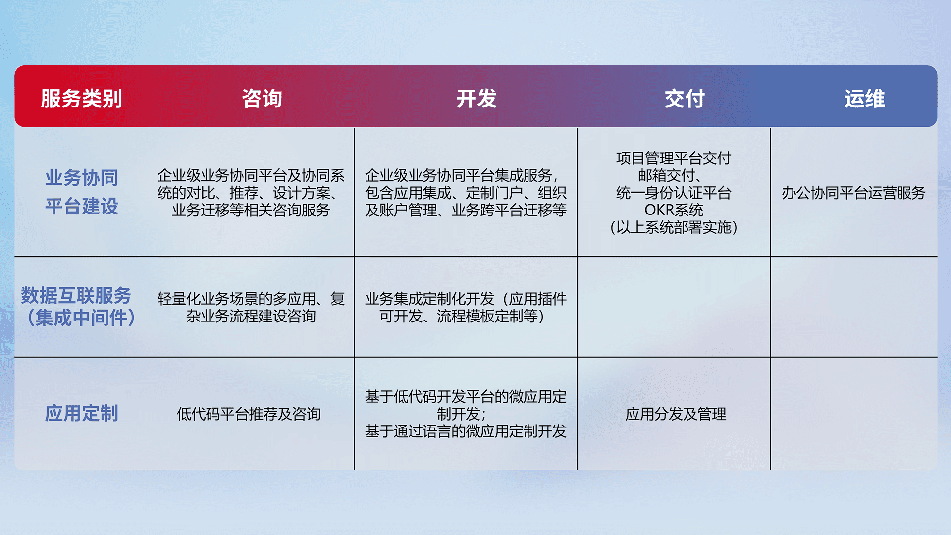 针对钉钉、、、、企微、、、IDaas等平台级产品提供产品的规划、、方案、、、、交付、、定制化开发等服务,,,,实现如统一协同办公、、、智能客户服务、、混合会议管理、、、、智能数据查询、、等业务场景,,,,实现数字化转型。。。