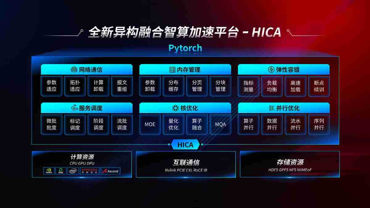 通过自研的服务层、、、中间适配层、、、、以及调度编排算法,,,,采用数据并行、、模型并行等多种并行方式,,,,把并行计算任务进行有效的分解,,使其分别由相应的软件栈和算力资源来承接。。。。当GPU资源变化,,HICA可以实时动态调度计算子任务并调整模型拓扑和架构,,,,以充分聚合各种算力资源。。。。