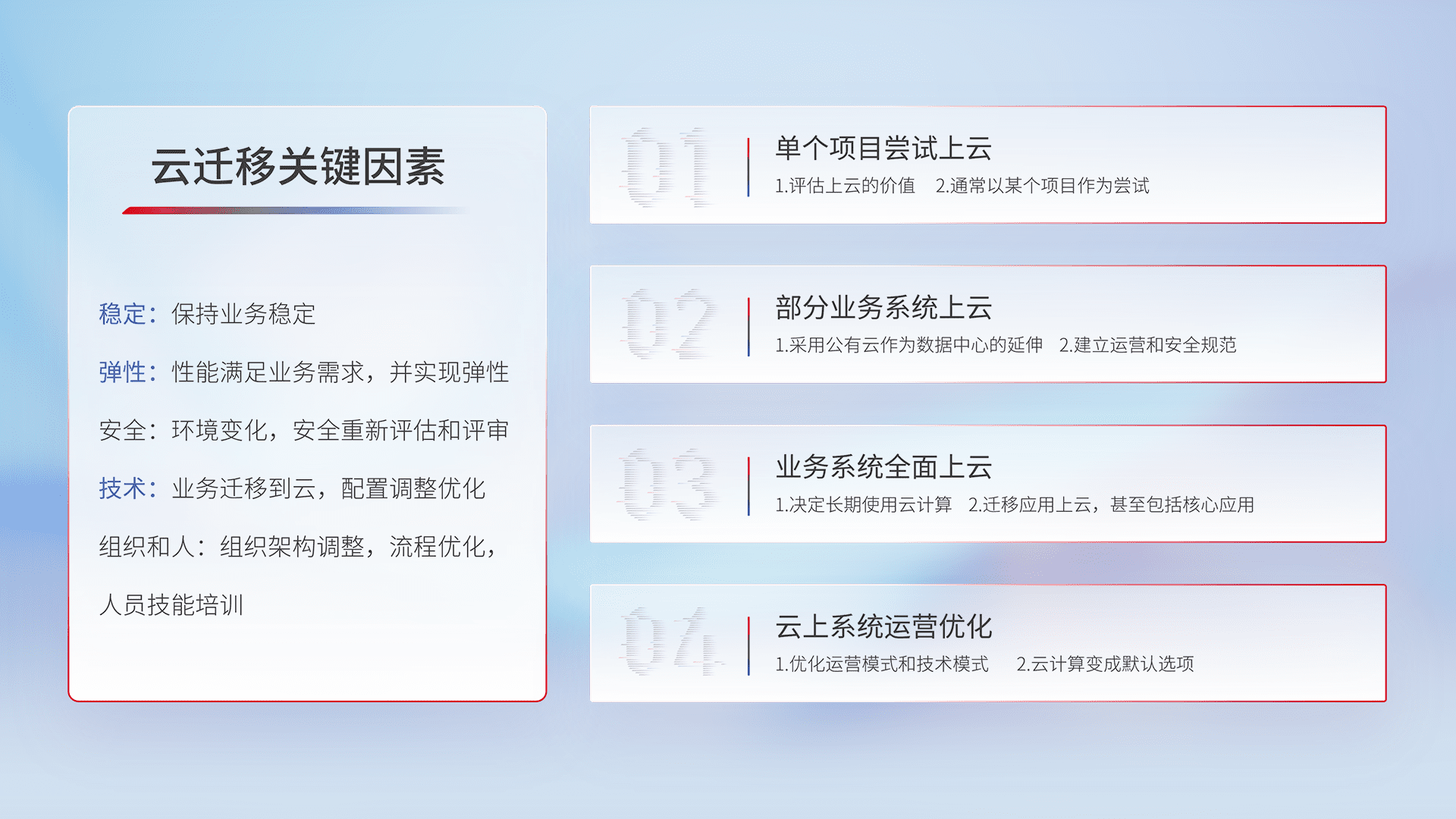 结合实际业务,,从规划设计、、、云平台选型、、、云原生改造、、、、数据迁移、、集成交付,,迁移全过程为客户识别最佳上云路径,,,,做好风险识别管理,,,,设计网络架构、、、、身份权限、、安全审计合规、、、、操作审计、、、、日志审计、、、监控告警策略、、、、多站点容灾设计等,,,,对云上基础设施进行整体规划,,提升IT治理水平,,,以满足弹性、、、高可用、、、、高性能的需求。。